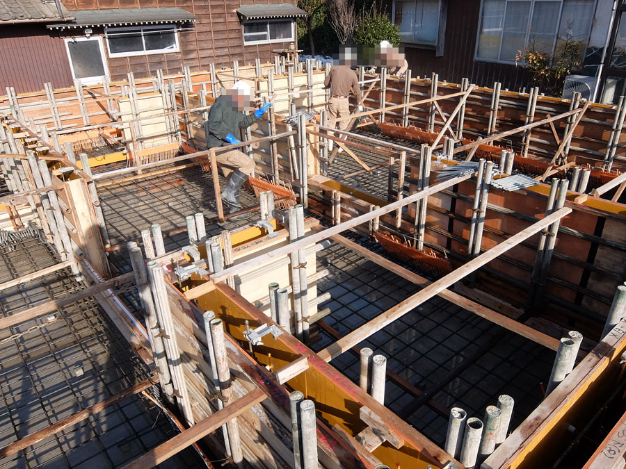 先日紹介したとおり、例の「櫛型」のあふれ止めを設置しているので、一回で1210mmある立ち上がりに一気にコンクリート流し込む。スラブと基礎立ち上がりを一度に打ち込むとても耐久性と白蟻対策に優れた基礎の作り方である。