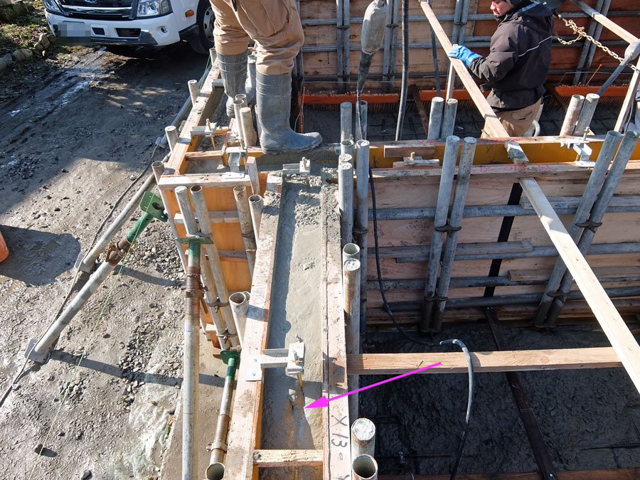 この櫛型を使わないとこのように一気に上までコンクリートを流し込むと、基礎下からスラブに流れ出しうまくいかないが、写真のとおりコンクリートがせき止められるので上まで打ち込むことが可能。この打ち込み動画は近日アップする予定。