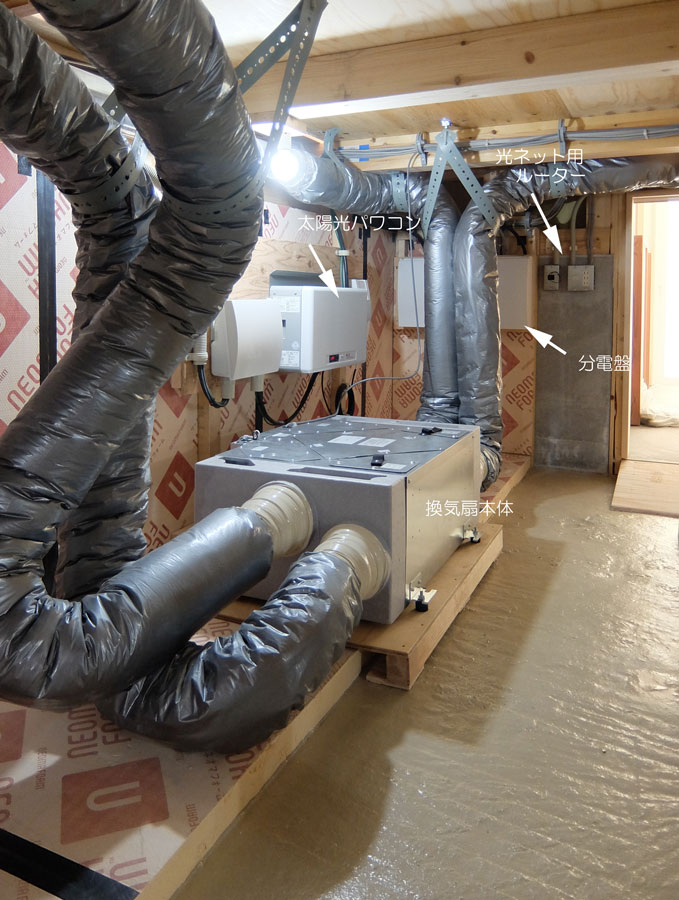 これは換気扇本体が2017年頃から床上に上向きで設置できるように改定されたため、「緑の家」ではいままで天井懐等に設置していた本体を、床下内で床置きすることに変え、2017年以後9年前から換気扇設置はではこの位置が標準となっている。