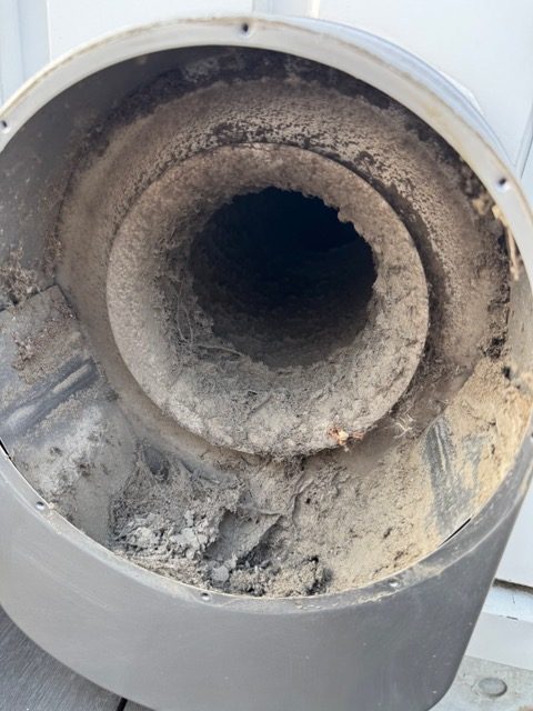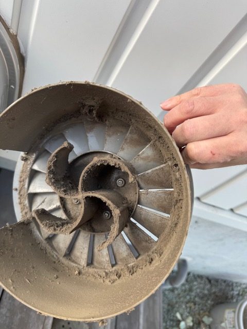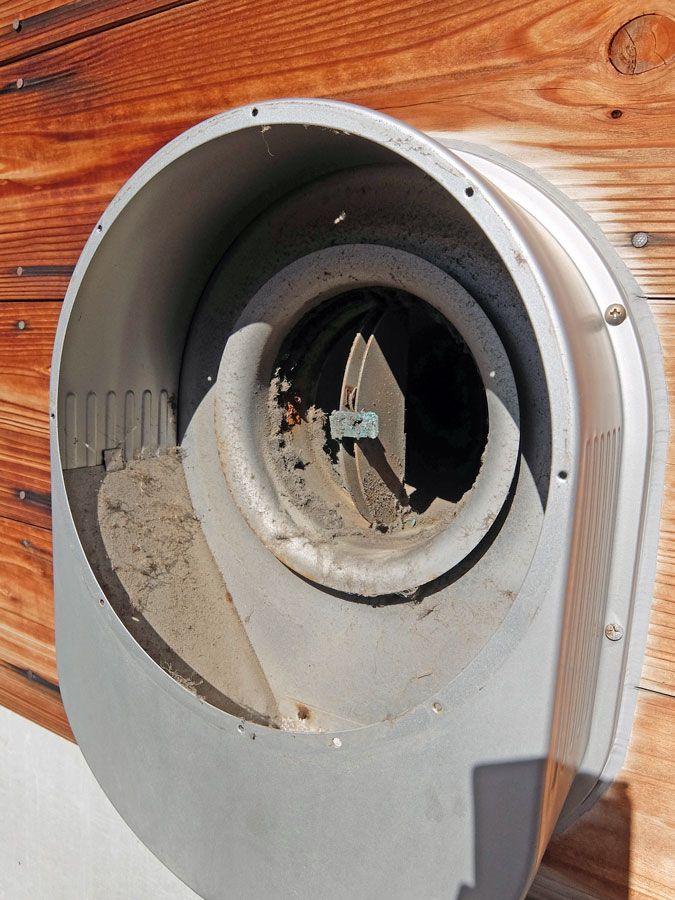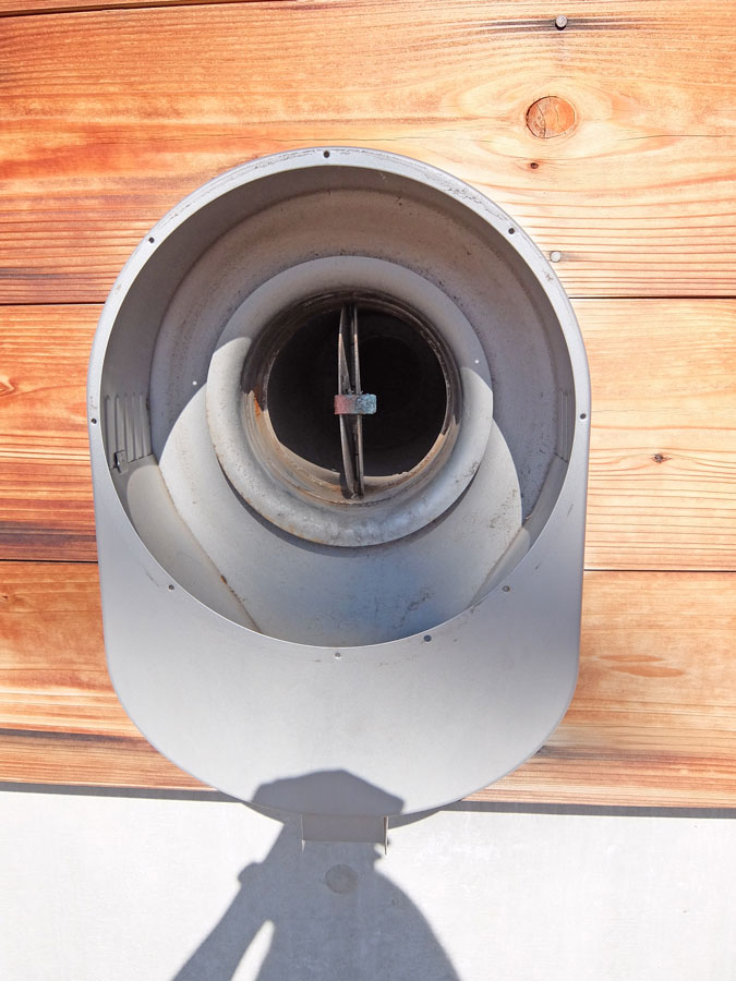 このように土埃が主体となりそこに繊維が絡み水滴も付いたりしてゴミが蓄積されたいったのであろう。これがわかったのはなんといっても手の届く高さにこのフードがあり、建て主さん自身が容易にメンテナンスできたためである。