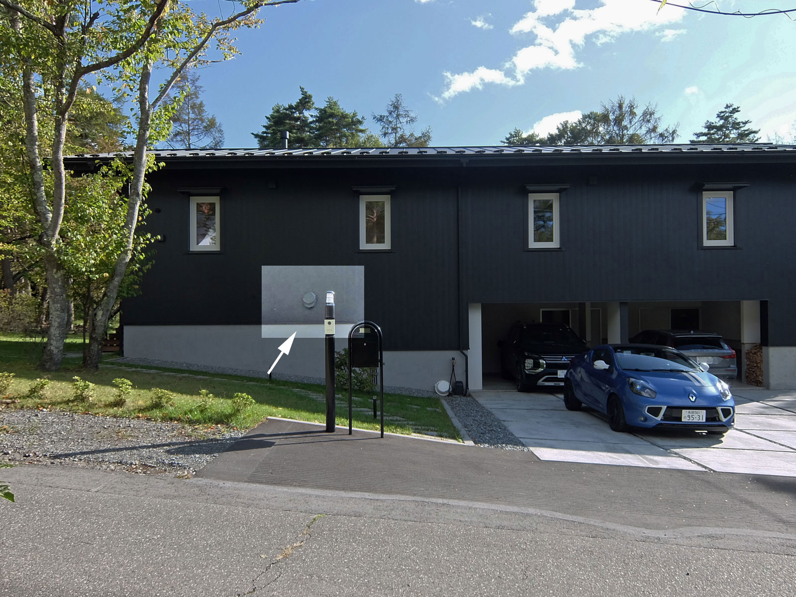 調査対象のサイクロンフードはご覧のとおり位置は低く家の前面となる。これはこの地域が準防火地域で且つ街中であるため、左右の配置は好ましくないと考えてこの位置になった。確かに駐車時の排気ガスの問題はあるが、短時間である事と車まで2m離れているのでここに計画。特に問題はないとのこと。