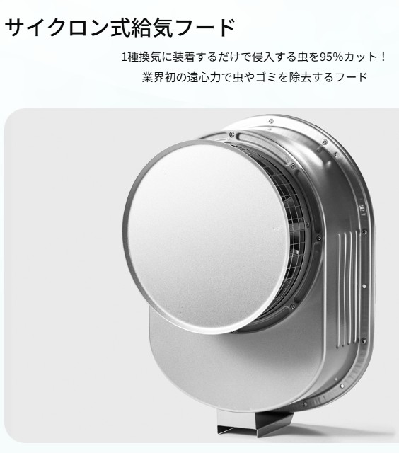サイクロンフードとはこのような形状の外壁に設置する給気専用のフード。