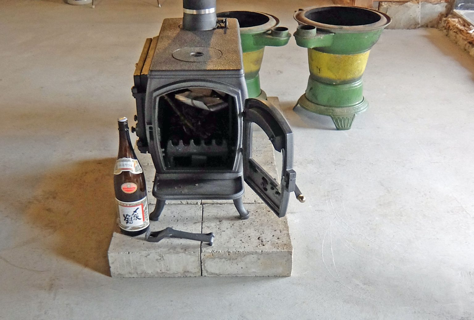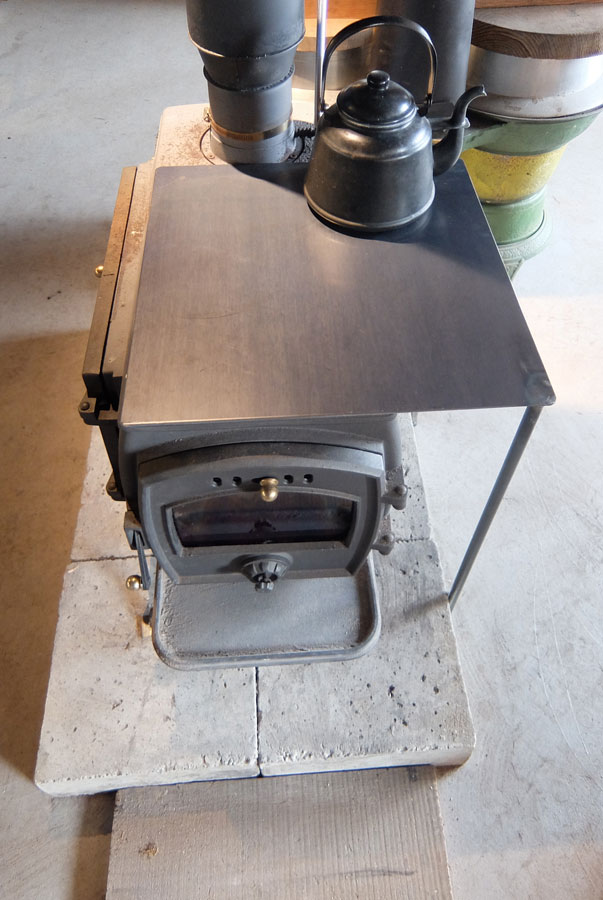 元々の製品が上のように細長い薪ストーブですが、このままではヤカン1つと鍋が載るくらいで料理するには少しものたりない。そのため折角のストーブ料理が同時にできないばかりか、直接鋳物の天板に載せるため暖まった料理には火力が強すぎる場合が多い。そこで下のように一枚天板を重ねて設置することで両解決する。