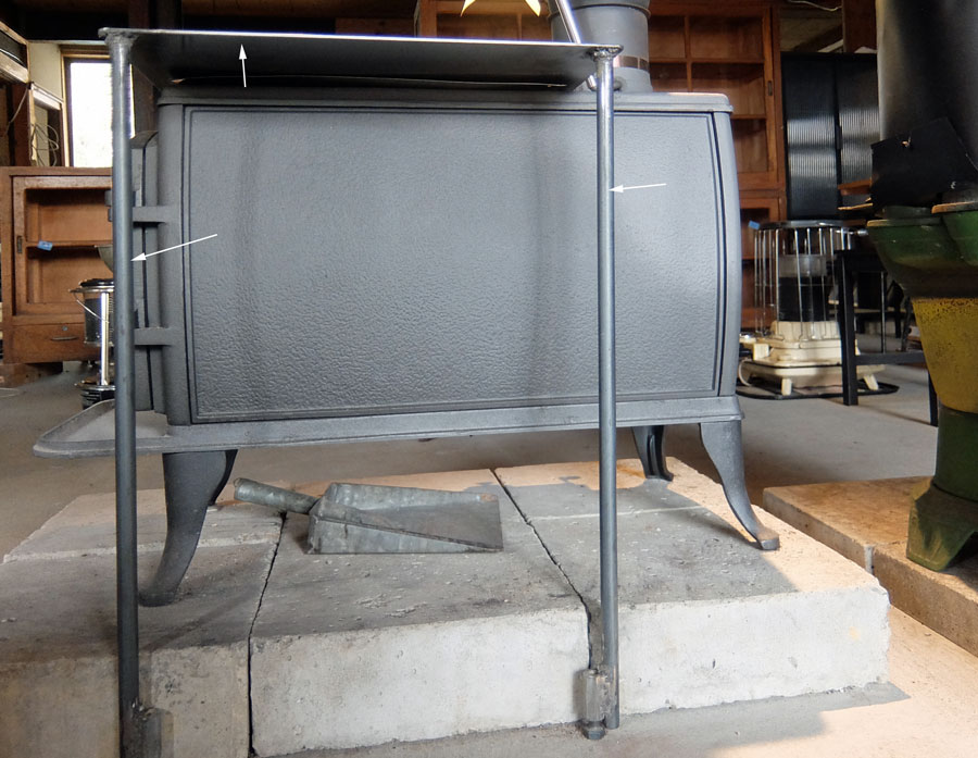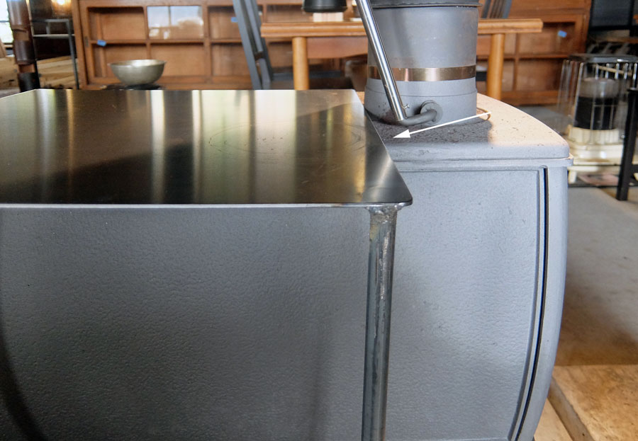 天板は厚さ3.2mmで足は16φの鉄筋丸棒を溶接。白い矢印部分が製作した天板とその足。色は黒皮とストーブの黒塗装がほぼ同じで一体に見える。