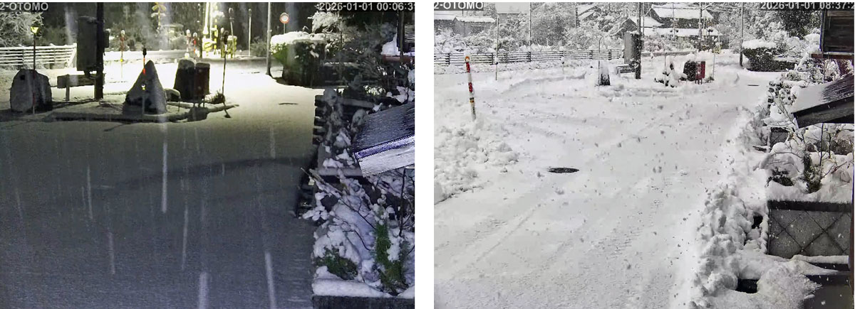 otomo vie centで年越しとなりここでも元旦にまとまった雪が降った。上左は年越しの0時で起きたらすでに除雪車が通って道はきれいだが真っ白な風景に。
